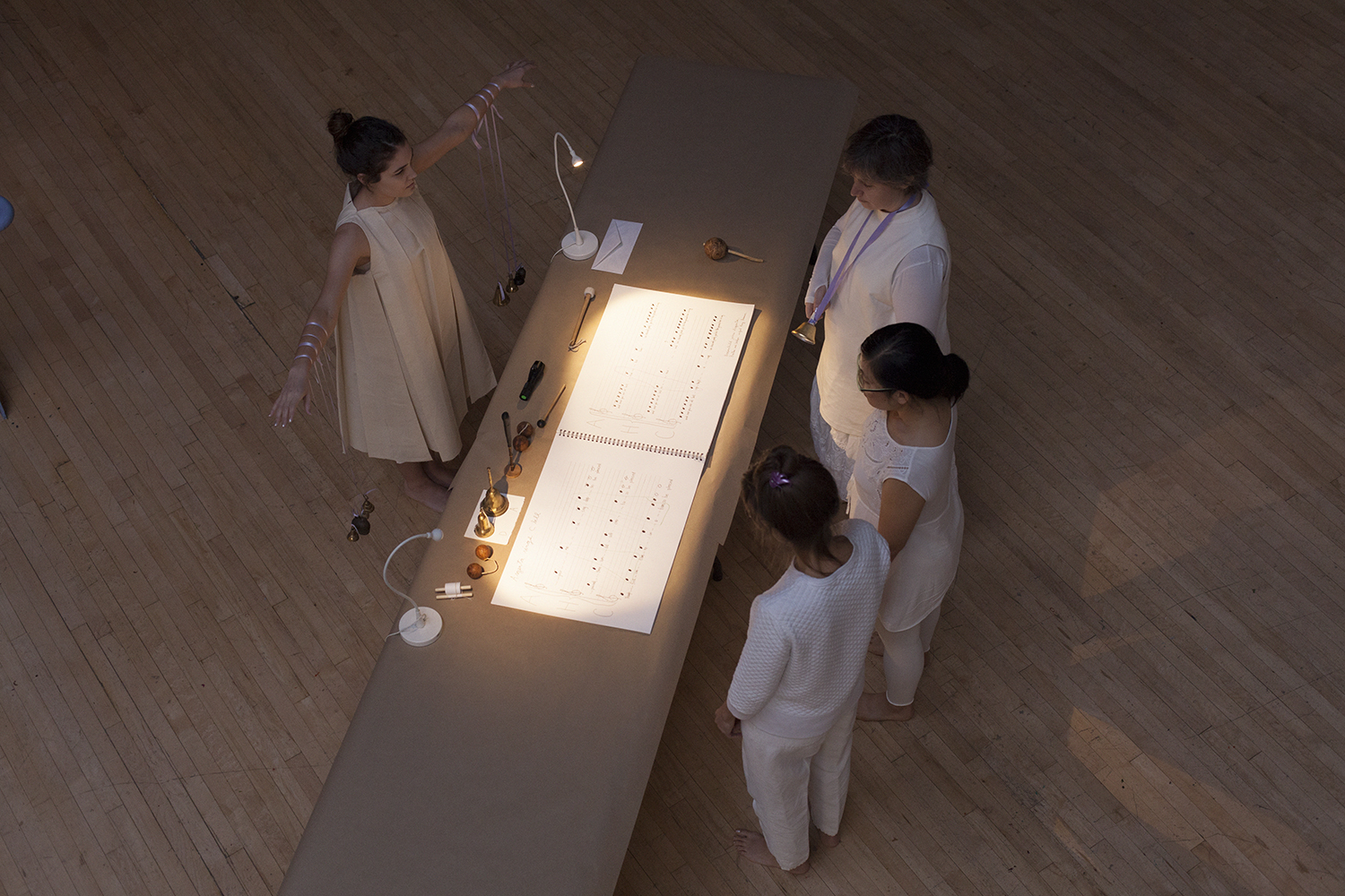 For Brainchild Part 4 composer and multi-instrumentalist Laura Steenberge created a layered A Cappella score for the waning daylight of the Armory’s two-story art studio. The audience watched from above as the novice Brainchild, guided by the chorus, a set of handbells, and the shared oversized songbook, learned the score’s melodies.